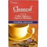 Cleancaf? Brand Cleaner and Descaler is an essential component to maintaining great tasting coffee at home. Cleancaf? is designed to remove flavor-tainting stale coffee oil residue from home machines. Its dual action formula also prevents the accumulation of scale deposits which are responsible for slow brew times and machine malfunctions. Portion packaged for easy use, Cleancaf? also contains a blue-dye which helps to ensure proper rinsing. Directions: 1.Dissolve contents of Cleancaf? package in 1L of warm water. Pour into water reservoir. Put empty pot and filter basket in place. For espresso machines attach handle and place an empty container below. 2.Turn machine on and begin the brew cycle. For espresso machines, also allow several ounces of Cleancaf? solution to flow through steam pipe (into a container to avoid spray.) Discard entire solution once it has passed through your machine. 3.Rinse all components and repeat steps 1 and 2 twice with clean water only. Espresso machines remove handle. You may soak handle and filters in Cleancaf? solution then rinse all components with clean water